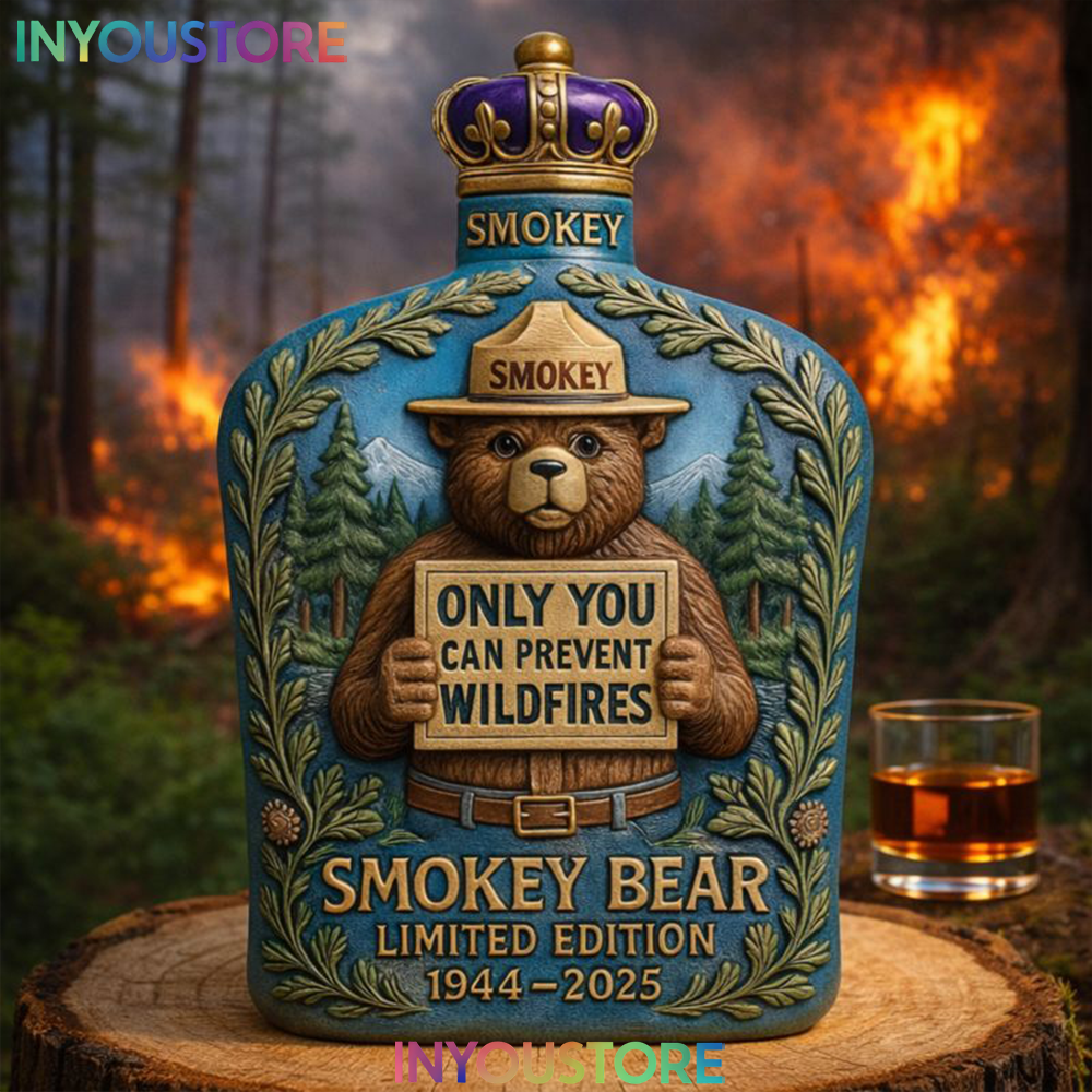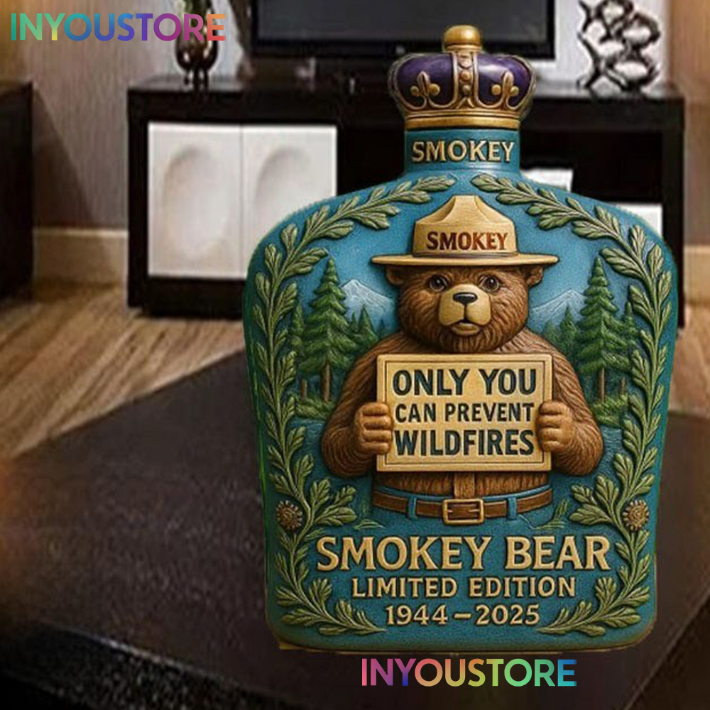 Crafted from high-quality glass with detailed Smokey Bear–inspired artwork, this bottle is ideal for holding whiskey, bourbon, or other favorite spirits. Whether displayed in a home bar, cabin, office, or collector’s shelf, it adds a bold and timeless character to any space.