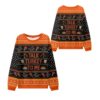 This sweater is a visual feast! Set against a classic black backdrop, the vibrant orange cuffs, collar, and hem create a bold autumnal contrast. The chest proudly displays the cheeky phrase “TALK TURKEY TO ME” in a rustic, eye-catching font, flanked by frothy beer mugs and delectable slices of pie—a true tribute to Thanksgiving indulgence. The design is woven together with repeating patterns of roasted turkey legs, wishbones, and traditional Fair Isle-inspired motifs, creating that perfectly “ugly” yet undeniably charming aesthetic that everyone loves. The high-definition, all-over print ensures that every detail is sharp, vibrant, and ready for its close-up in all your holiday photos.s atmosphere, the guest who loves to break the ice, and anyone who believes the holiday season should be filled with laughter.