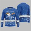 Our sweater for 2025 reimagines Michelangelo’s iconic “The Creation of Adam” for the modern sports fan. Set against a classic navy blue backdrop dotted with falling snow, the centerpiece features two celestial hands meeting not to spark life, but to pass a pristine white rugby ball. Above this hallowed exchange, the words “THANK GOD FOR RUGBY” are proudly displayed in a clean, white font. The design is framed by a traditional Fair Isle pattern featuring wintery fir trees, prancing reindeer, and classic snowflake motifs along the hem and cuffs, blending sacred sporting passion with timeless holiday style.