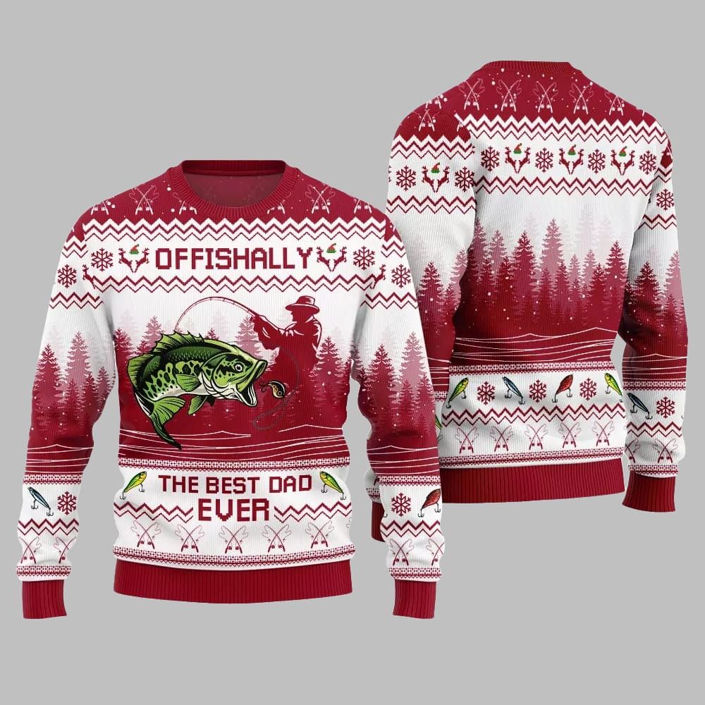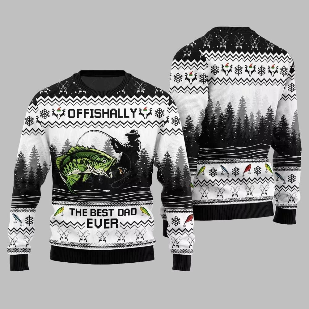 The centerpiece is a dynamic, beautifully detailed largemouth bass leaping from the water, hooked by a silhouetted fsherman—a scene that will resonate with any true angler. Framed by classic winter patterns of snowflakes and pine forests, this sweater perfectly merges the thrill of the catch with the magic of Christmas. The clever “OFFISHALLY” pun, combined with the “THE BEST DAD EVER” declaration and detailed fishing graphics.