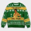 Fans of The Big Lebowski will recognize the witty details woven into this design, from the bowling pins to the retro holiday patterns. The imagery connects the sweater directly to the film’s iconic themes of friendship, absurdity, and unexpected adventures in Los Angeles.