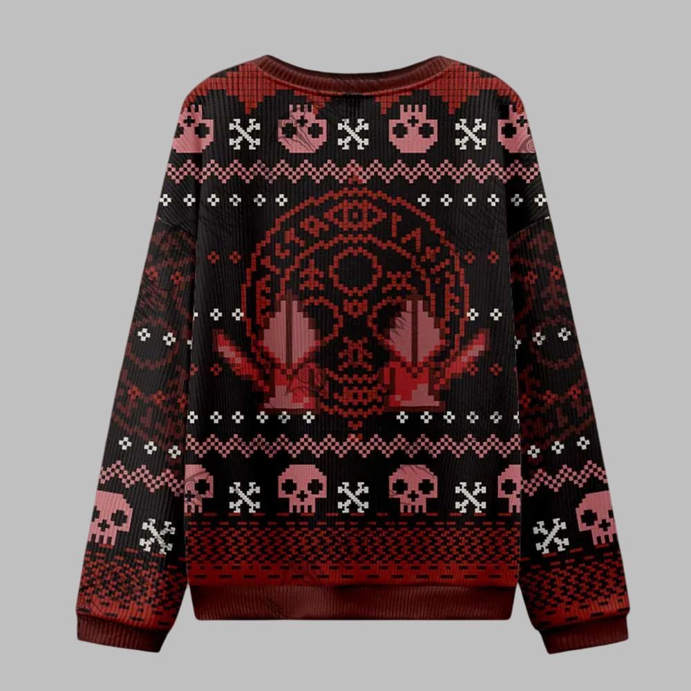 At the heart of this sweater is a stunning, high-definition graphic of a lone warrior, their form defined by flowing white hair and the immense, shattered blade they wield. This powerful central image is not just a design; it’s a narrative of resilience and strength, perfect for those who appreciate deep lore and character-driven art. The art style is sharp and dynamic, breaking free from the sweater’s dark, corduroy-textured background. The back is just as impressive, featuring a large, pixelated sigil of a winged skull, reinforcing the sweater’s edgy, fantasy-inspired theme. This isn’t just clothing; it’s wearable art for the discerning fan.