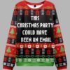 The full-print design utilizes the bold, traditional holiday colors of red, black, and green, and is adorned with festive motifs like Christmas trees, Santa faces, and wrapped gifts. The sweater’s central graphic is a hilarious and modern take on the classic holiday party dilemma. The bold text, presented in a playful pixelated font, reads: “THIS CHRISTMAS PARTY COULD HAVE BEEN AN EMAIL.” This sweater serves as a piece of commemorative apparel for the universal struggle of mandatory office fun and inefficient gatherings. It perfectly captures the shared experience of every employee, making it an instant conversation starter and a humorous protest against workplace absurdities.