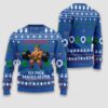Snowflakes, wreaths, and reindeer frame the character in a bold tableau that merges gym aesthetics with festive motifs. This sweater speaks to shifting ideals—where toughness meets kindness, and where even Santa’s crew hits the squat rack before gift duty.