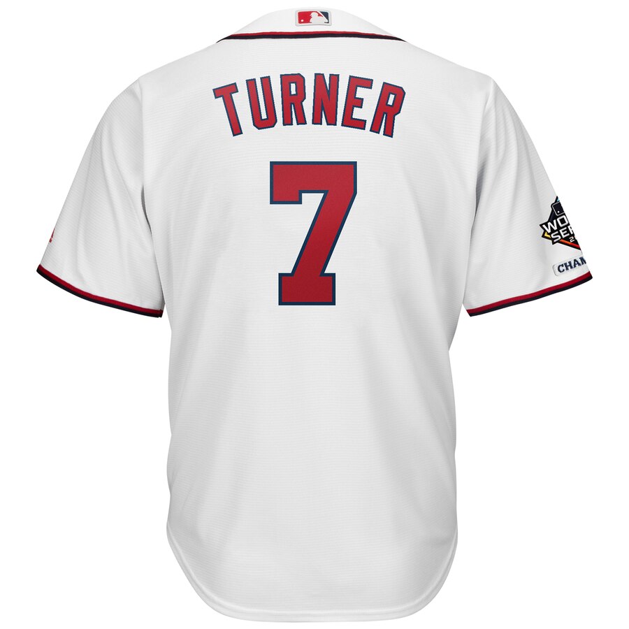 Trea Turner Washington Nationals Majestic 2019 World Series Champions Home Official Cool Base Bar Patch Player Baseball Jersey – White
