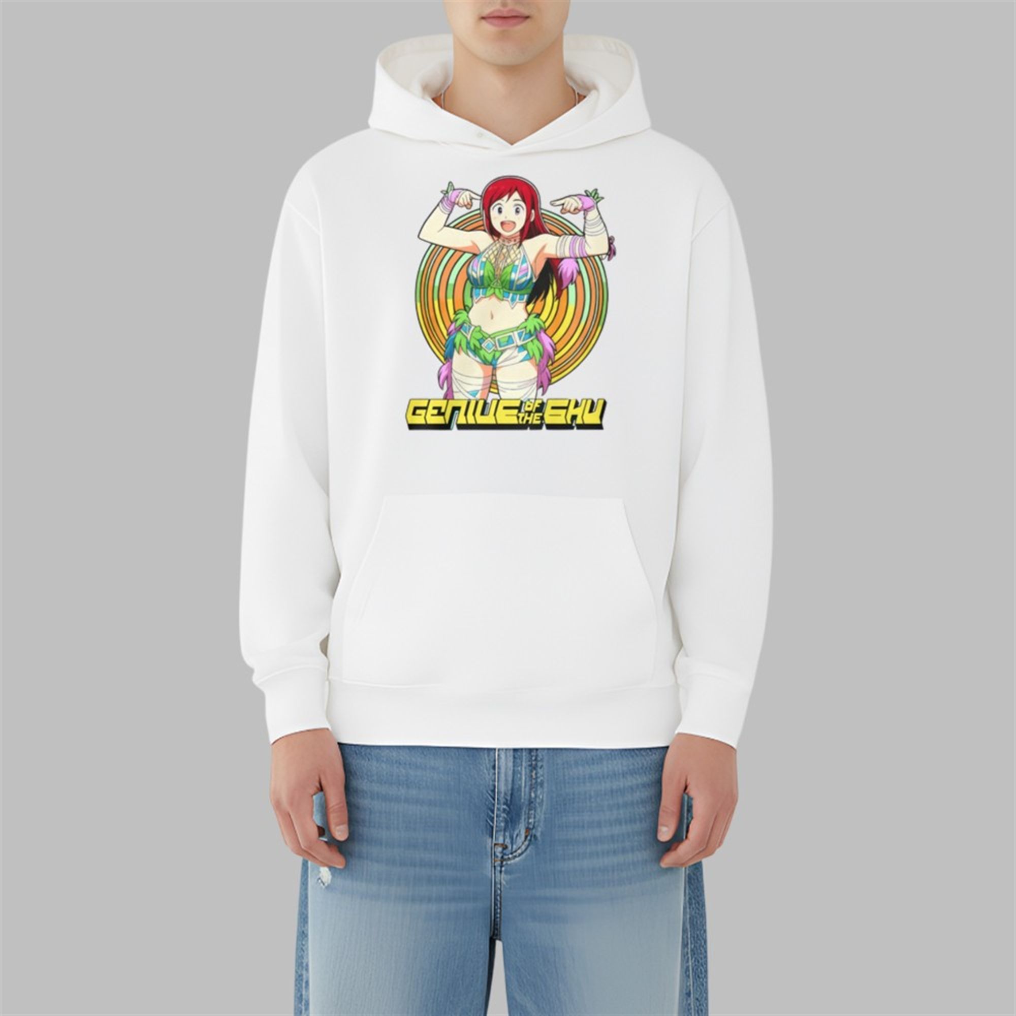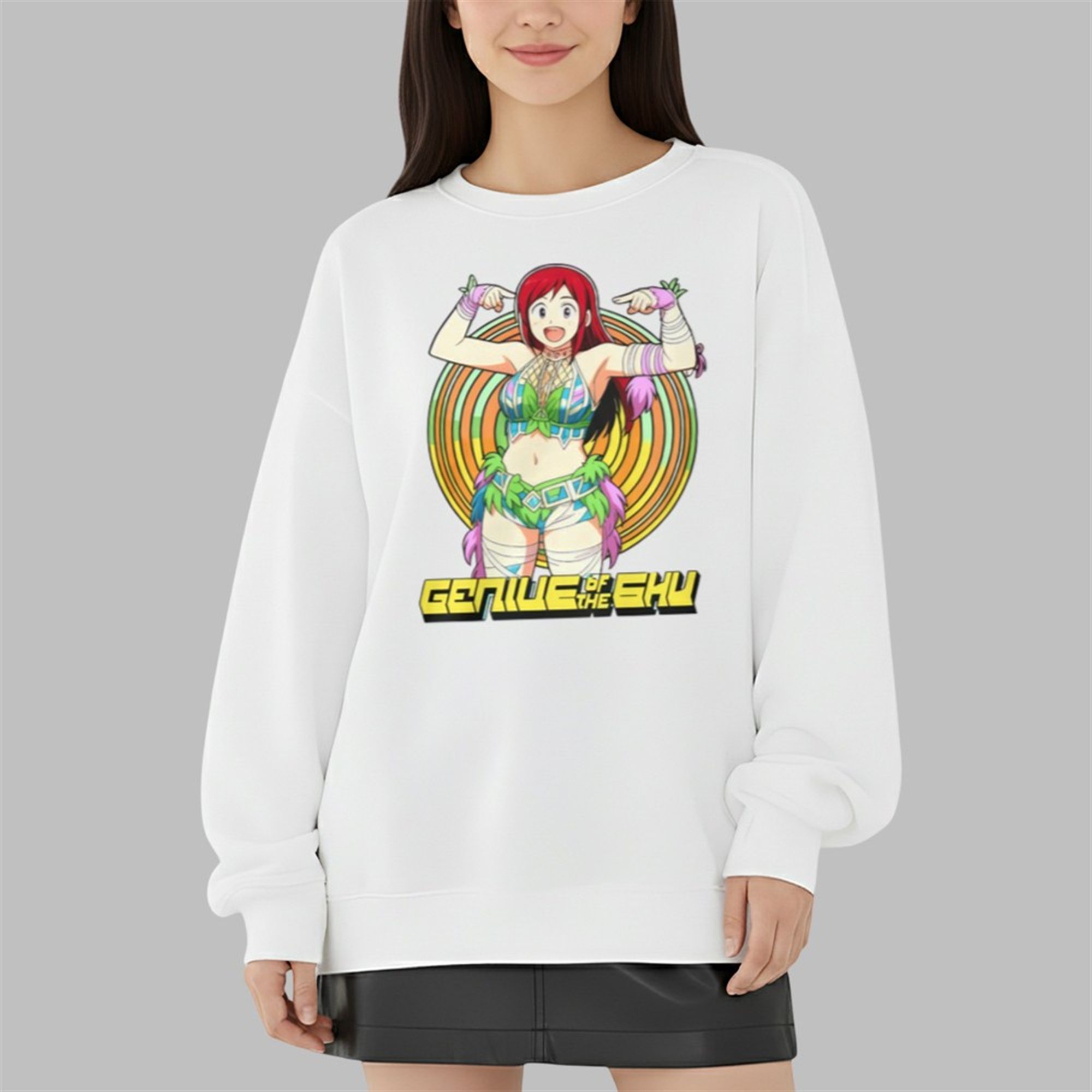 - Retro-Futuristic Font: The text “GENIUS OF THE SKY” is emblazoned in a stylized, blocky, ’80s-inspired font, adding a retro-cool element that perfectly complements the modern anime illustration.