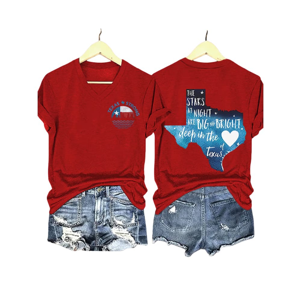 V-Neck Retro Texas Strong The Stars At Night Are Big And Bright Deep In The Heart Of Texas Print T-Shirt – A Tribute Tee for the Heartbroken and the Brave
