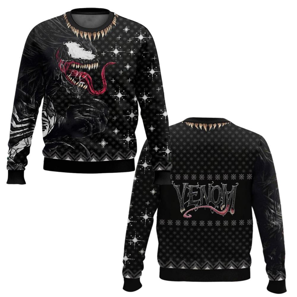 This isn’t your grandma’s Christmas sweater! Dive headfirst into the holiday season with the Venom The Last Dance Ugly Sweater. This unique and eye-catching sweater is perfect for fans of the iconic Marvel anti-hero, Venom, who want to showcase their love for the symbiote while embracing the festive spirit. . The back of the sweater proudly displays the “Venom” logo in a bold, stylized font, ensuring you make a statement from every angle.