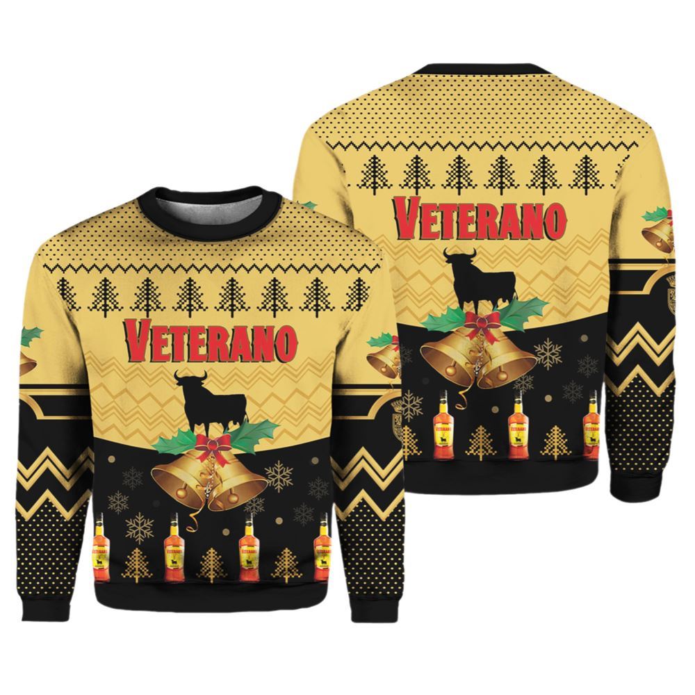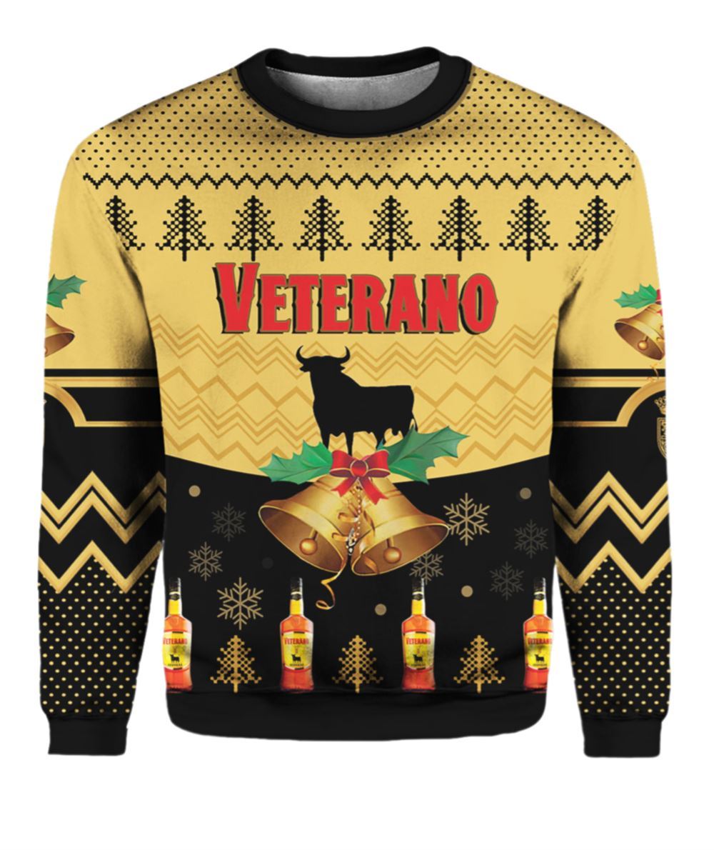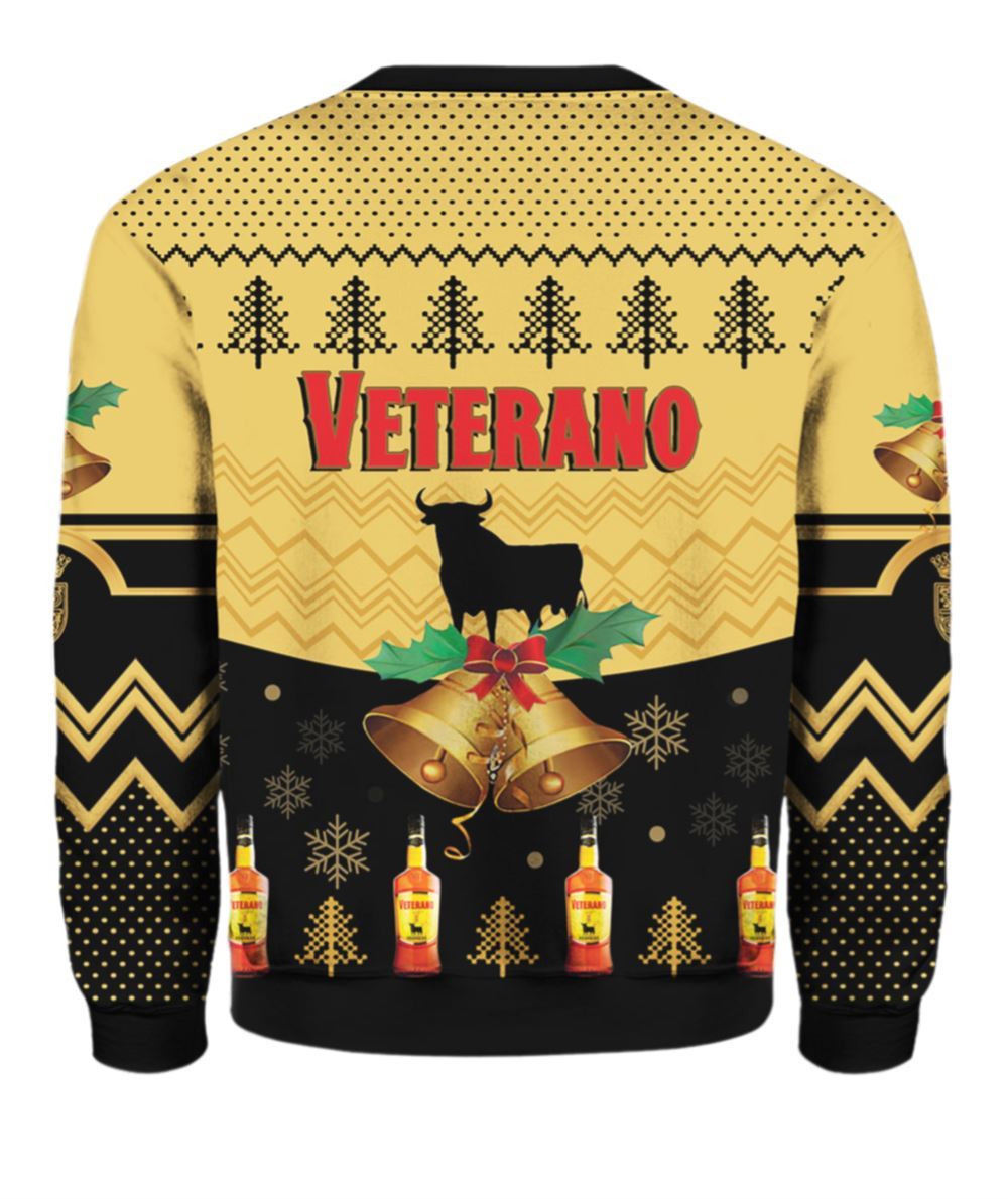 Ho-ho-hold the eggnog! This ain’t your grandma’s Christmas sweater. We’re talking about the Veterano Ugly Christmas Sweater , a festive masterpiece that’s sure to turn heads and raise a few eyebrows this holiday season. The striking gold and black color scheme is accented with festive Christmas trees, snowflakes, and jingle bells. Front and center is the iconic Veterano bull, a symbol of strength and Spanish heritage, adding an unexpected twist to the classic Christmas theme.