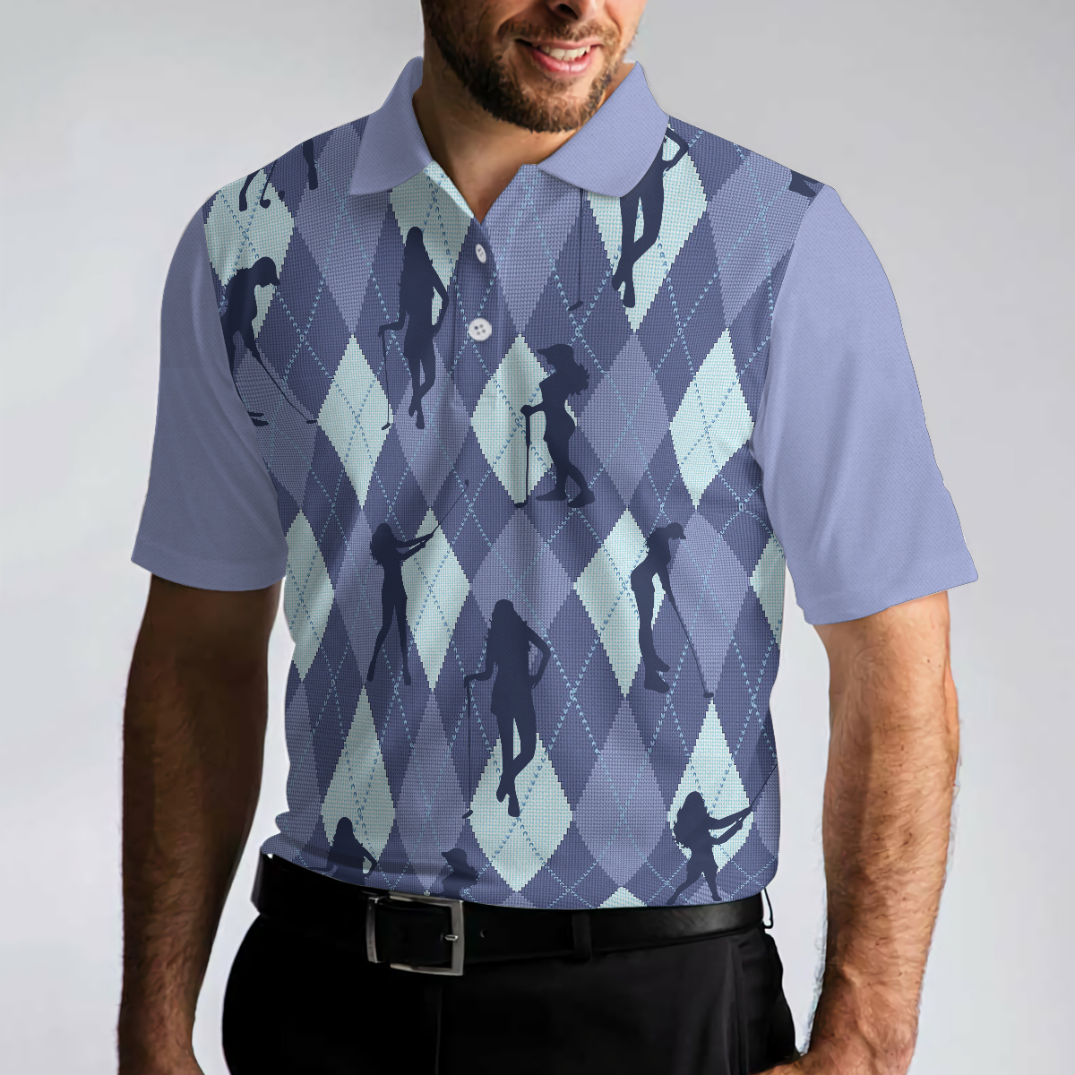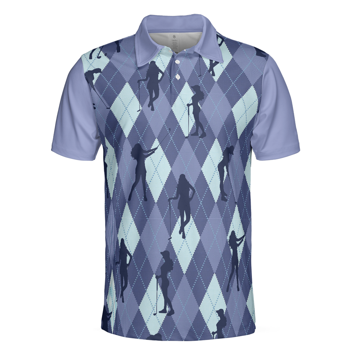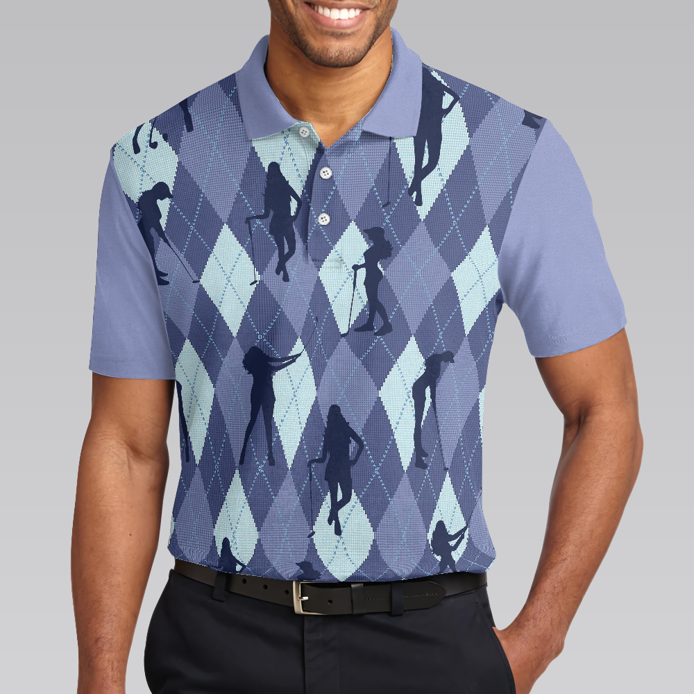 Vintage Blue Palatte Girl Golf Polo Shirt, Argyle Pattern Girl Golfer Silhouette Polo Shirt, Fun Golf Shirt For Men