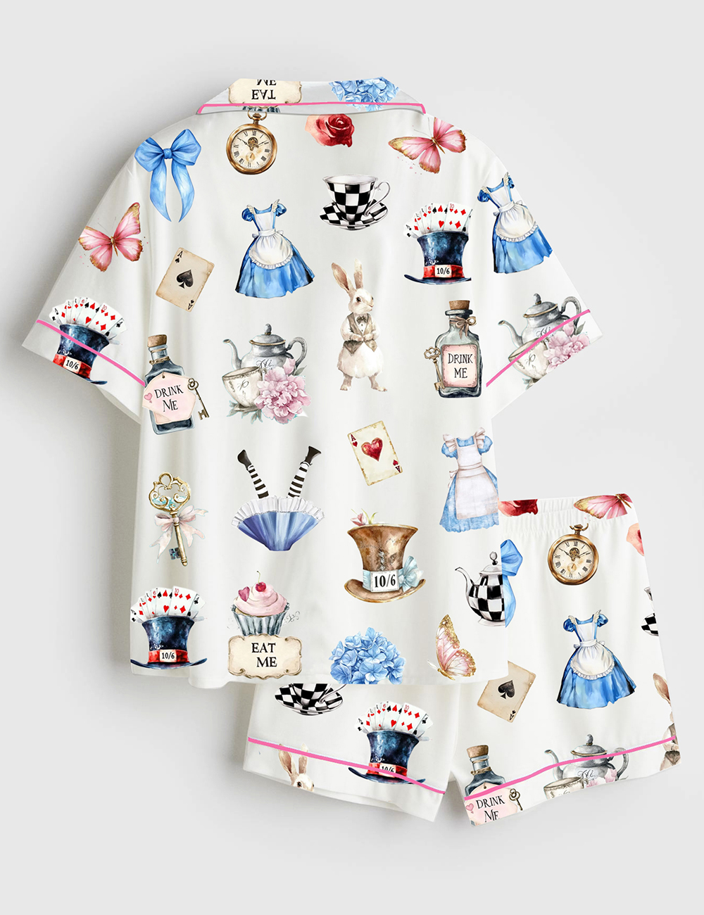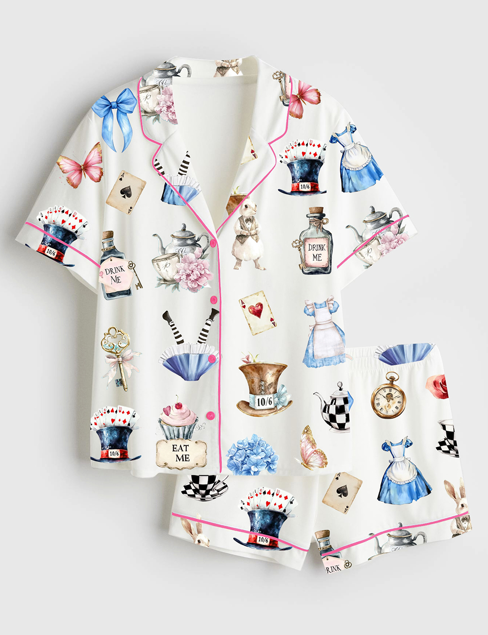 Women’s Alice In Wonderland Teapot Dress Mad Hatter Hat Tea Party Short Sleeve Satin Pajama Set