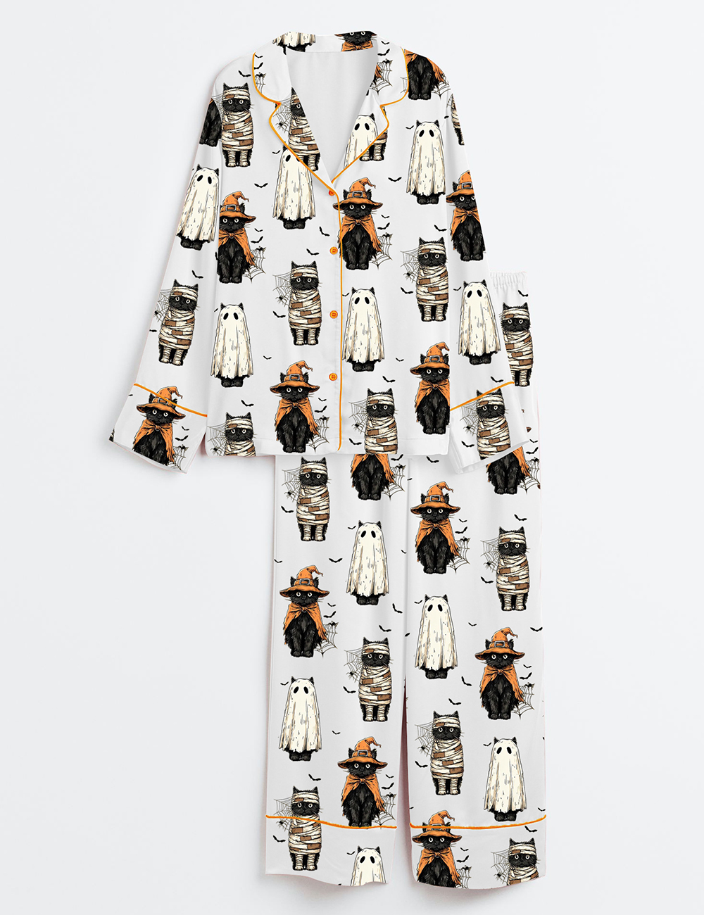 Women’s Black Cat Pumpkin Ghosts Cat Halloween Long Sleeve Satin Pajama Set