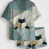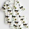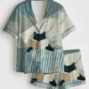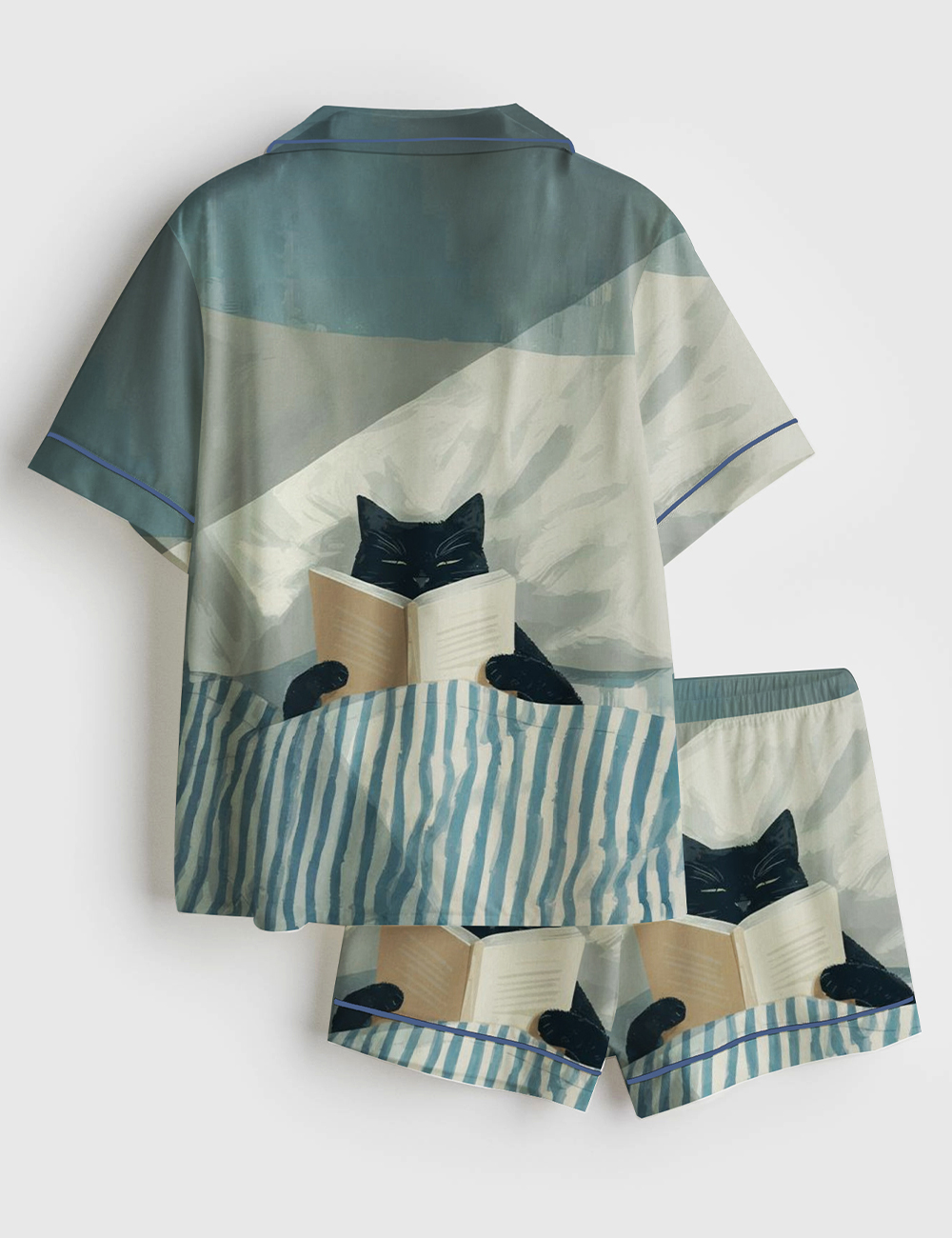 Women’s Black Cat Reading Print Cozy Cat Book Lover Short Sleeve Satin Pajama Set