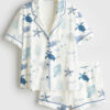 Women’s Summer Beach Ocean Coastal Summer Nautical Turtle Conch Bow Bachelorette Short Sleeve Satin Pajama Set