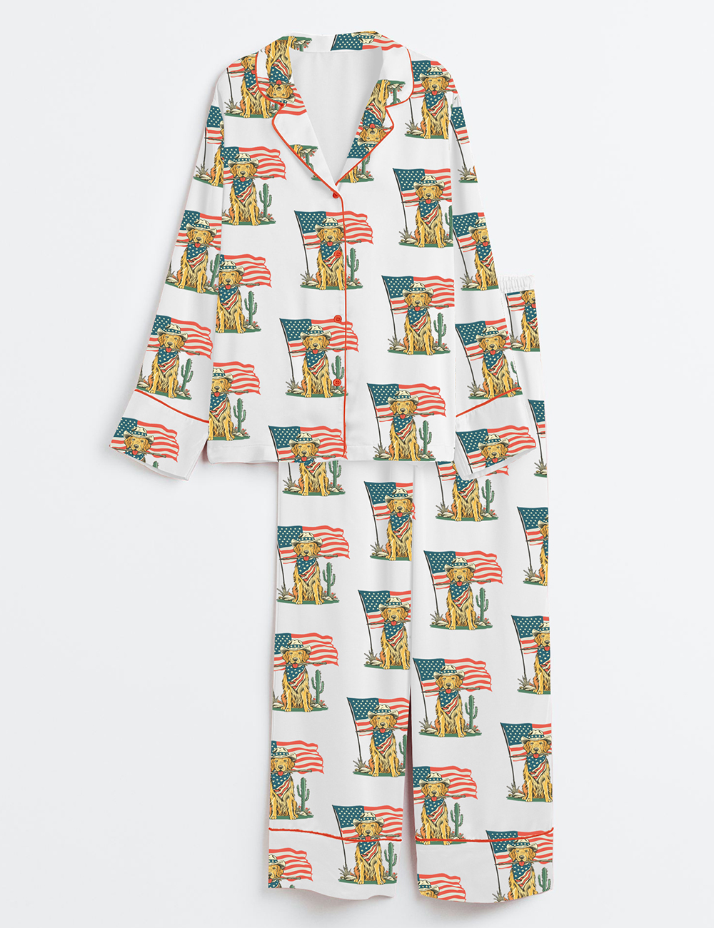 Women’s American Golden Retriever Cowboy Dog American Flag 4th Of July Western Long Sleeve Satin Pajamas Set