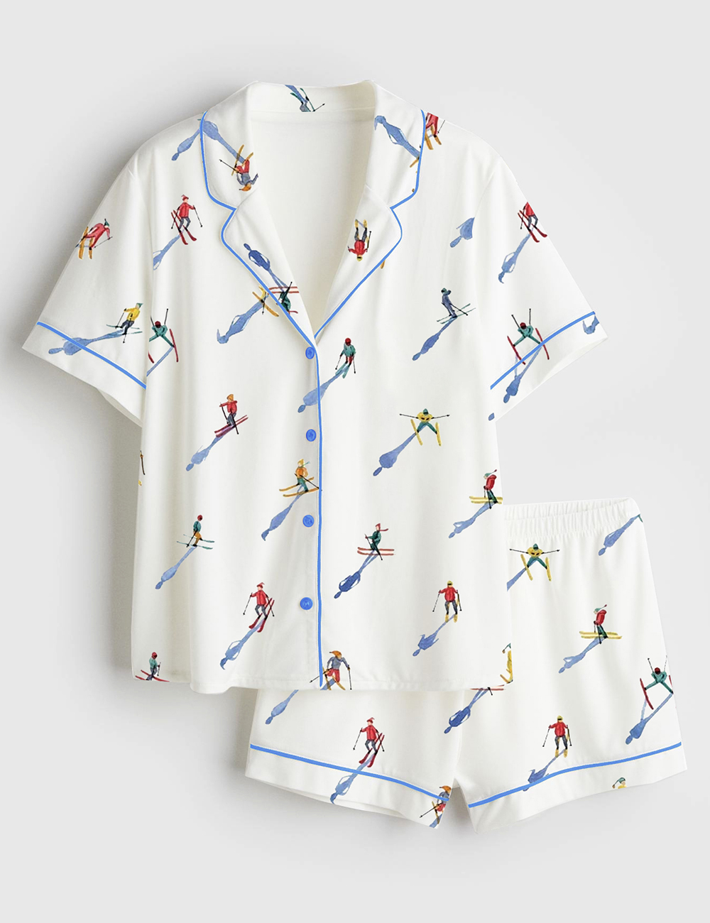 Women’s Apres Ski Mini Skier Minimalist Watercolor Ski Print Short Sleeve Satin Pajama Set