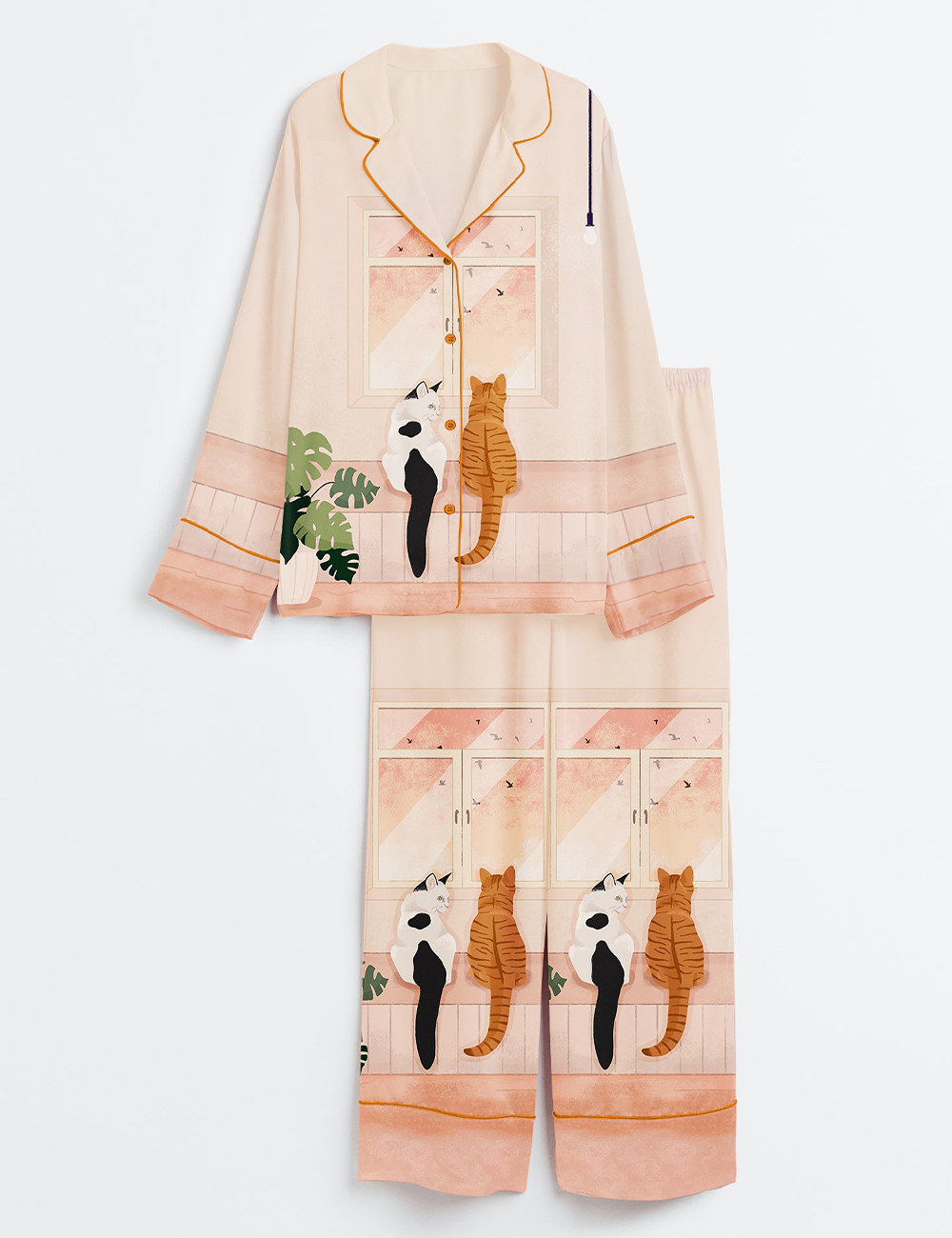 Women’s Cats Watching Birds In Window Cat Lover Long Sleeve Satin Pajama Set
