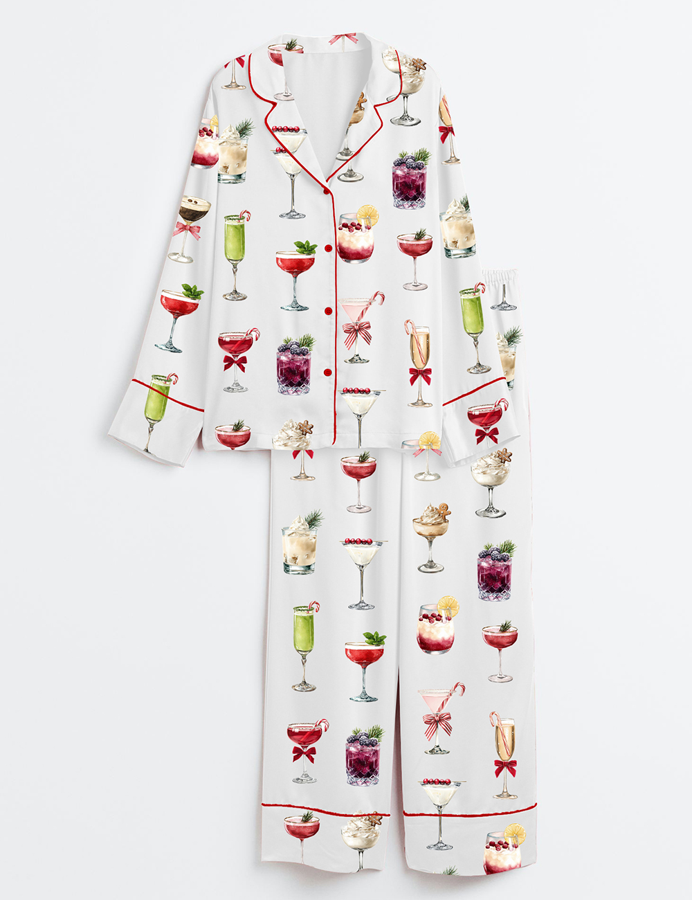 Women’s Christmas Cocktail Holiday Drink Long Sleeve Satin Pajamas Set