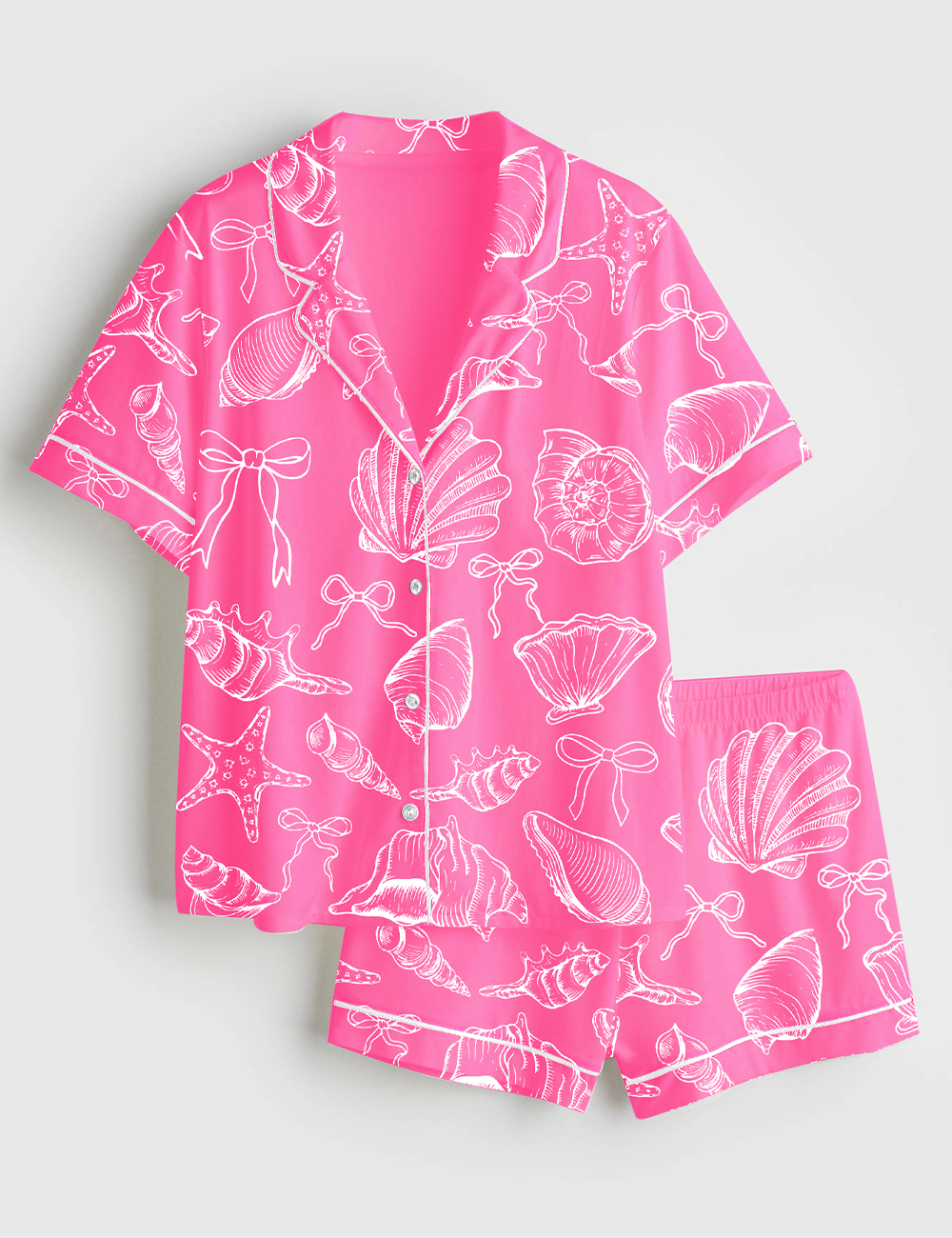 Women’s Coquette Seashell Beach Coastal Summer Vibes Print Short Sleeve Satin Pajamas Set