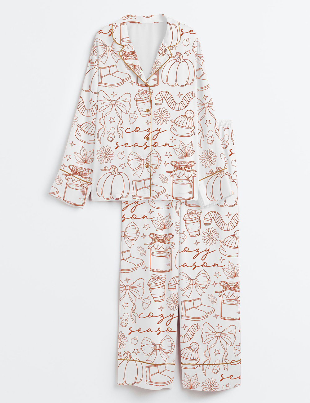 Women’s Cozy Season Fall Vibes Fall Pumpkin Autumn Season Long Sleeve Satin Pajama Set