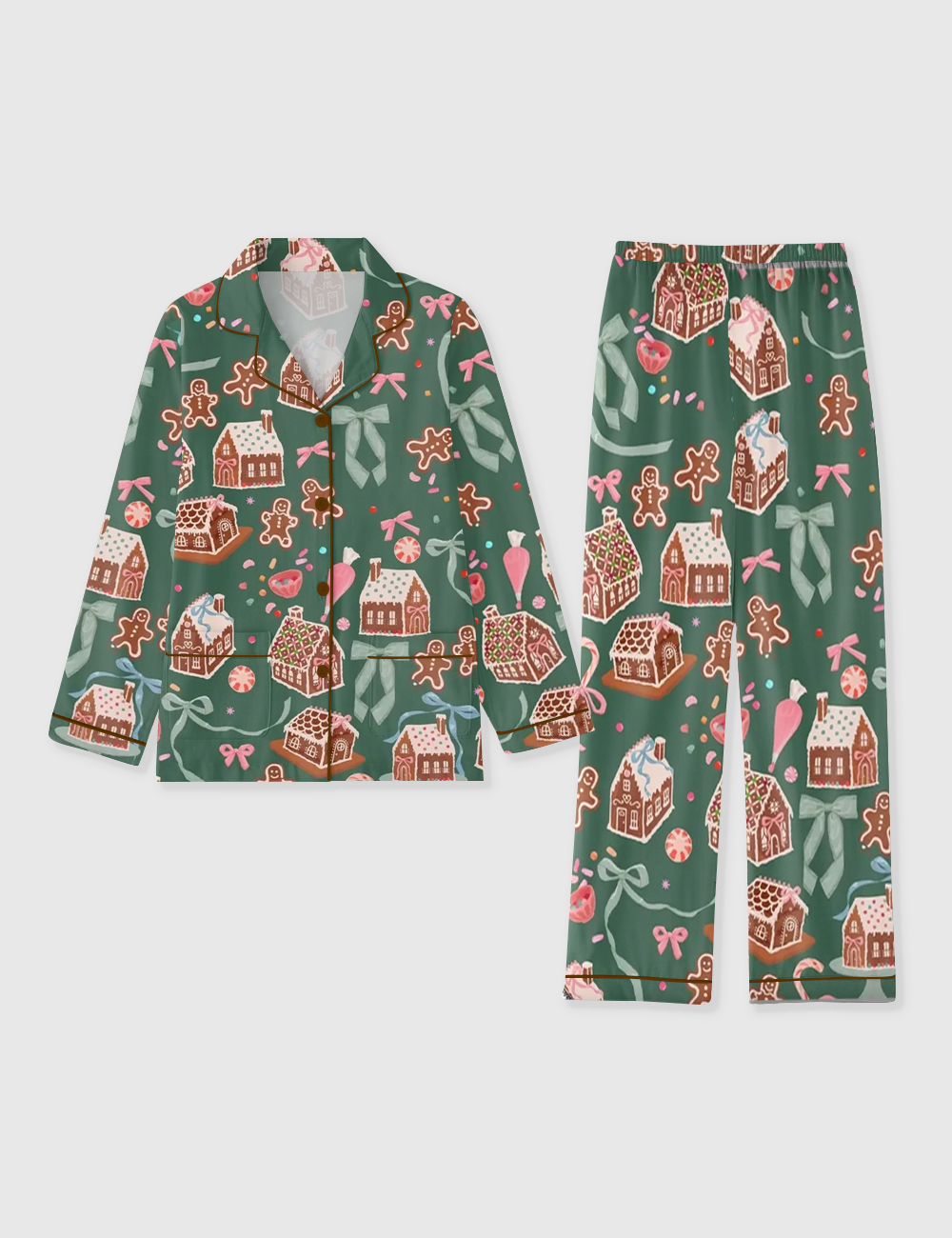 Women’s Green Gingerbread Bow Christmas Holiday Long Sleeve Pocket Cotton Pajamas Set