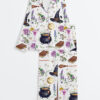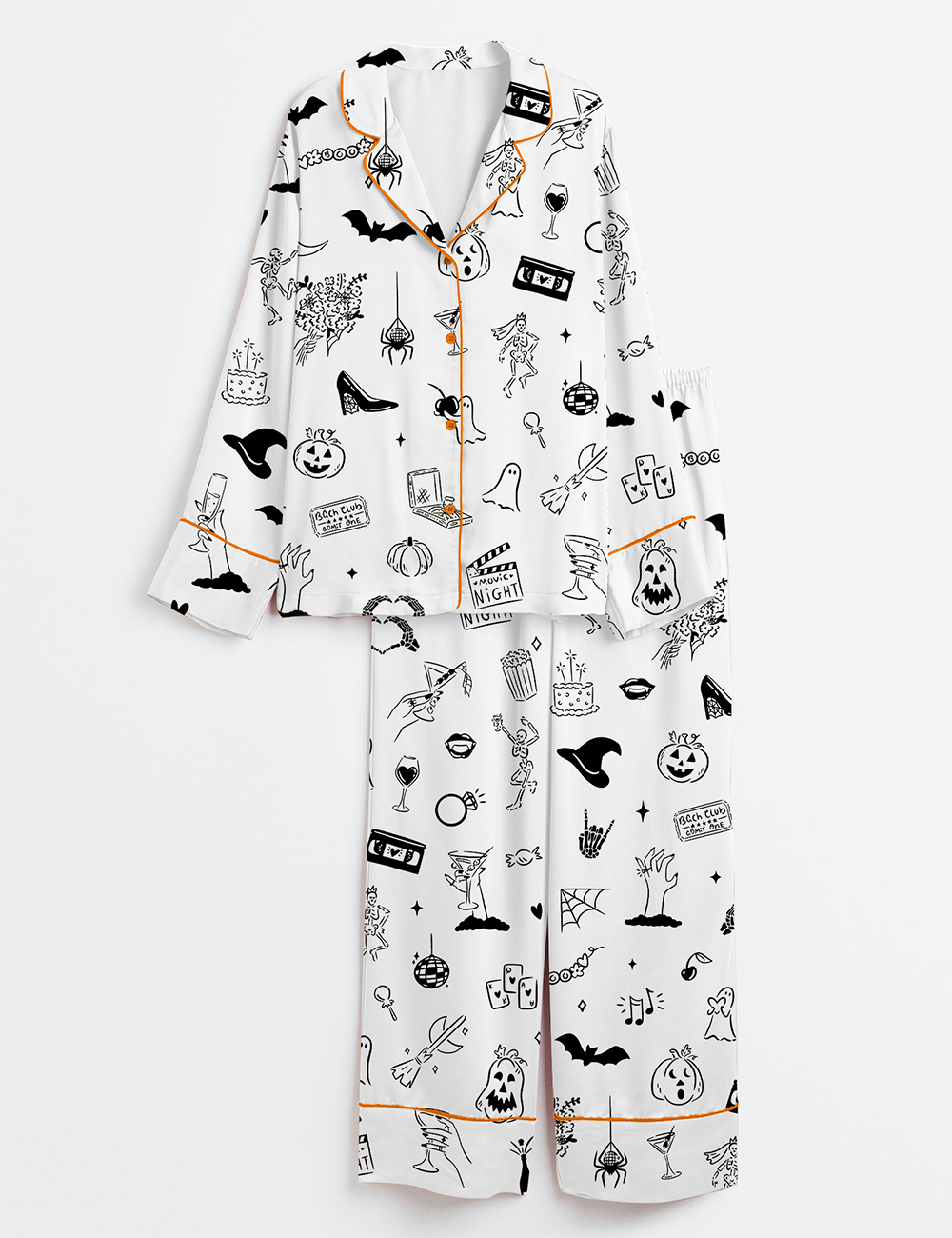 Women’s Hand Drawn Halloween Bachelorette Whimsical Doodles Spooky Clipart for Halloween Movie Night & Witchy Bachelorette Party Invite Long Sleeve Satin Pajamas Set