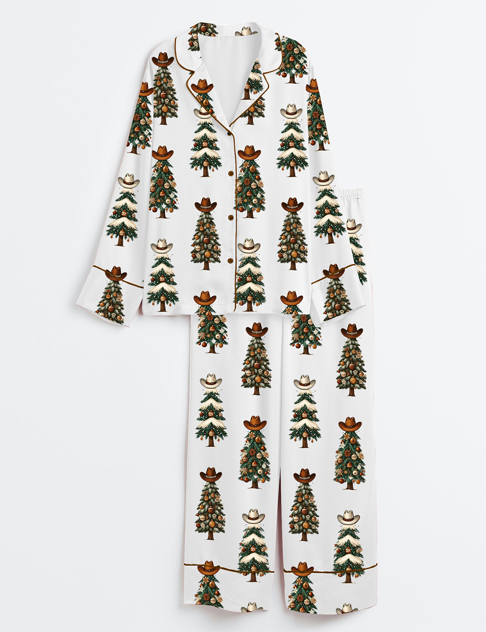 Women’s Howdy Christmas Western Cowboy Cowgirl Retro Christmas Tree Long Sleeve Satin Pajamas Set