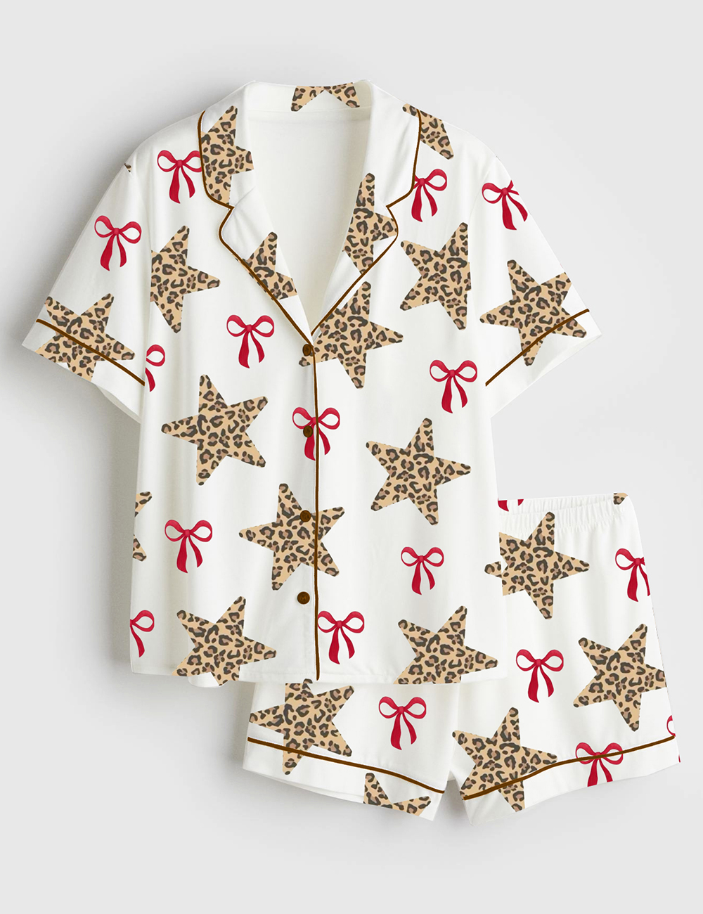 Women’s Leopard Star And Coquette Short Sleeve Satin Pajama Set