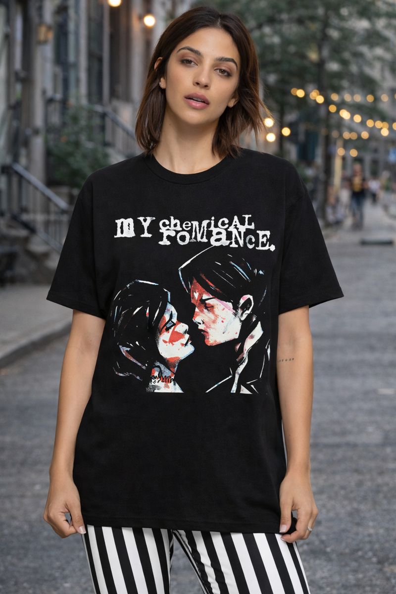 Product Description: Relive the golden era of Emo with our My Chemical Romance Oversized Shirt. This premium heavyweight tee features the iconic “Three Cheers for Sweet Revenge” inspired lovers graphic, capturing the raw, cinematic energy of Gerard Way’s legendary band. Designed for fans who crave that vintage 2000s alternative aesthetic combined with a modern, boxy silhouette, this shirt is an essential piece for any MCRmy member’s wardrobe.