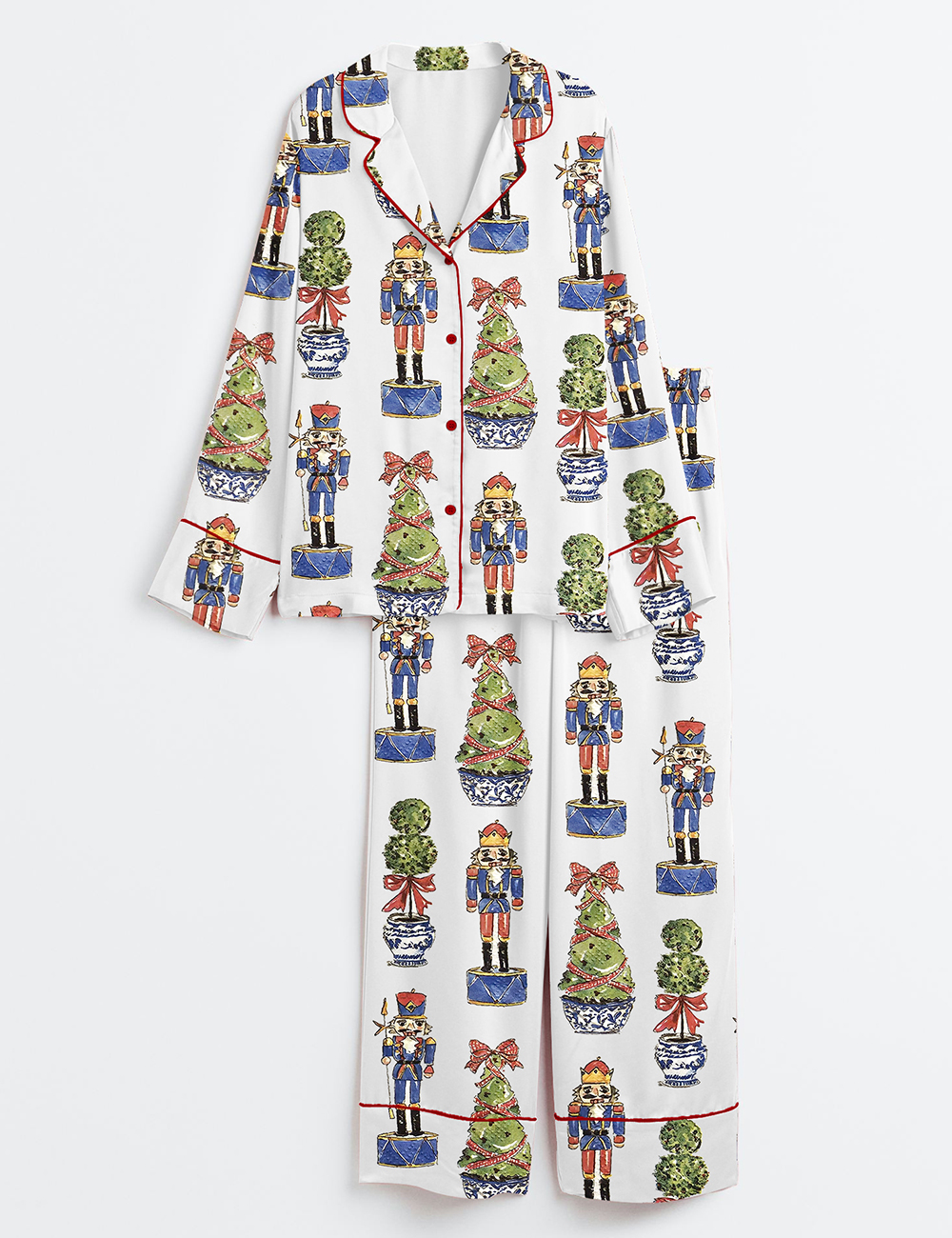 Women’s Nutcracker Topiary Christmas Tree Long Sleeve Satin Pajama Set