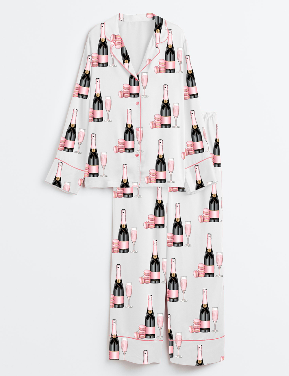 Women’s Pink Champagne Glass Dessert Long Sleeve Satin Pajamas Set