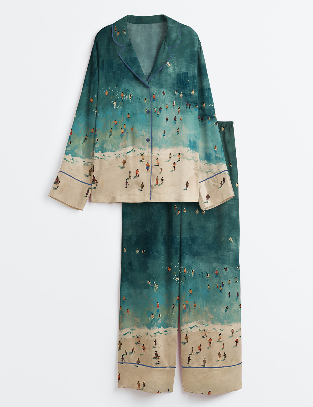 Women’s Tiny People Swimming In Ocean Summer Beach Travel Long Sleeve Satin Pajama Set
