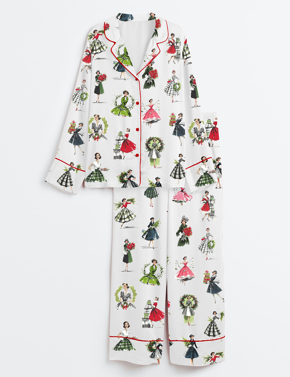 Women’s Vintage Christmas Lady Retro Holiday Fashion Long Sleeve Satin Pajamas Set