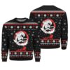 Embrace the holiday spirit with a terrifying twist! The Xenomorph Alien Christmas Ugly Sweater features a menacing Xenomorph emerging from a stylized red circle, reminiscent of a Christmas ornament, against a backdrop of classic snowflakes and geometric patterns. The creature’s terrifying silhouette is rendered in stark white, creating a striking contrast against the black background. The red accents add a festive touch while subtly referencing the Xenomorph’s deadly acidic blood.