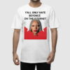 This Y’all Only Hate Beyonce On The Internet Shirt features the bold statement “Y’ALL ONLY HATE BEYONCÉ ON THE INTERNET†in stark black lettering across the chest. Below the text sits a stylized portrait of a braided-hair silhouette crowned by a red geometric accent, blending minimalist art with a powerful message.
