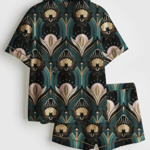 Women’s Vintage Elegant Art Deco Bats And Flowers Teal Fan Print Short Sleeve Satin Pajama Set