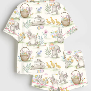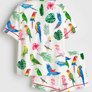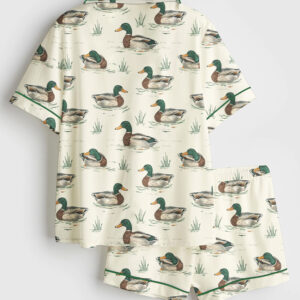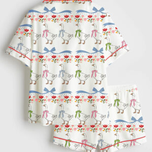 Women’s Vintage Goose Blue Ribon Trendy Cute Goose Print Short Sleeve Satin Pajama Set