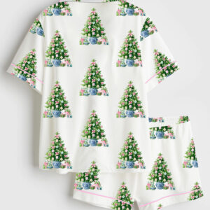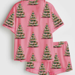 Women’s Watercolor Leopard Cheetah Pink Preppy Christmas Tree Short Sleeve Satin Pajama Set