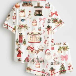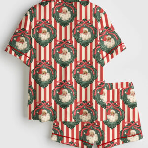 Women’s Watercolor Classic Christmas Preppy Christmas Santa Short Sleeve Satin Pajama Set