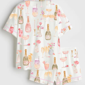Women’s Vintage Skiing Retro Apres Ski Bar Cart Alcohol Party Short Sleeve Satin Pajama Set