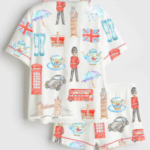 Women’s Watercolor London Art City Bus Sightseen Bridge Telephone Short Sleeve Satin Pajama Set