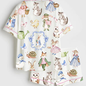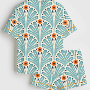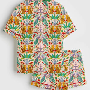 Women’s Tropical Bohemian Leopard Peacock Floral Art Print Short Sleeve Satin Pajama Set