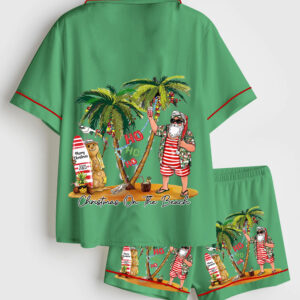 Women’s Tropical Christmas Aloha Beach Santa Holiday Short Sleeve Satin Family Pajama Set