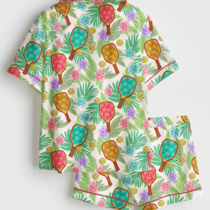 Women’s Tropical Pickleball Fun Vibrant Floral Game Day Sports Short Sleeve Satin Pajama Set