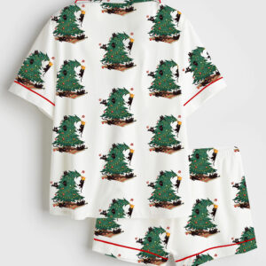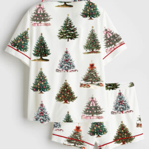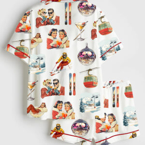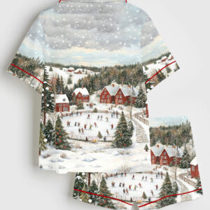 Women’s Vintage Christmas Town Snowy Winter Holiday Print Ski Lover Short Sleeve Satin Pajama Set